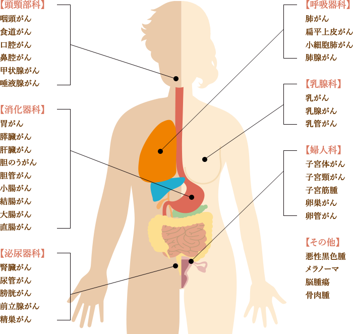標準治療が難しい膵臓がんや肺がんの他、消化器、呼吸器、泌尿器、婦人系の多くのがん種を治療可能です。