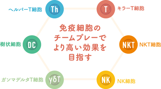 6種複合免疫療法に含まれる免疫細胞にはそれぞれ異なる作用があり、それぞれの細胞が連携をする事でより効果的にがん細胞を攻撃します。