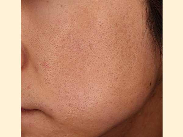 レーザーは無数の「点」で照射され、その点一つ一つが細かい穴のように蒸散されます。同時に蒸散した皮膚の内側に熱を伝え、コラーゲンが生成され、皮膚の上皮化と共に皮膚再生が促されます。他の侵襲性フラクショナルレーザーに比べ、肌への熱ダメージを極力抑えて皮膚を入れ替えていきます。1回の照射で肌の約10〜15%の再生が促されます。