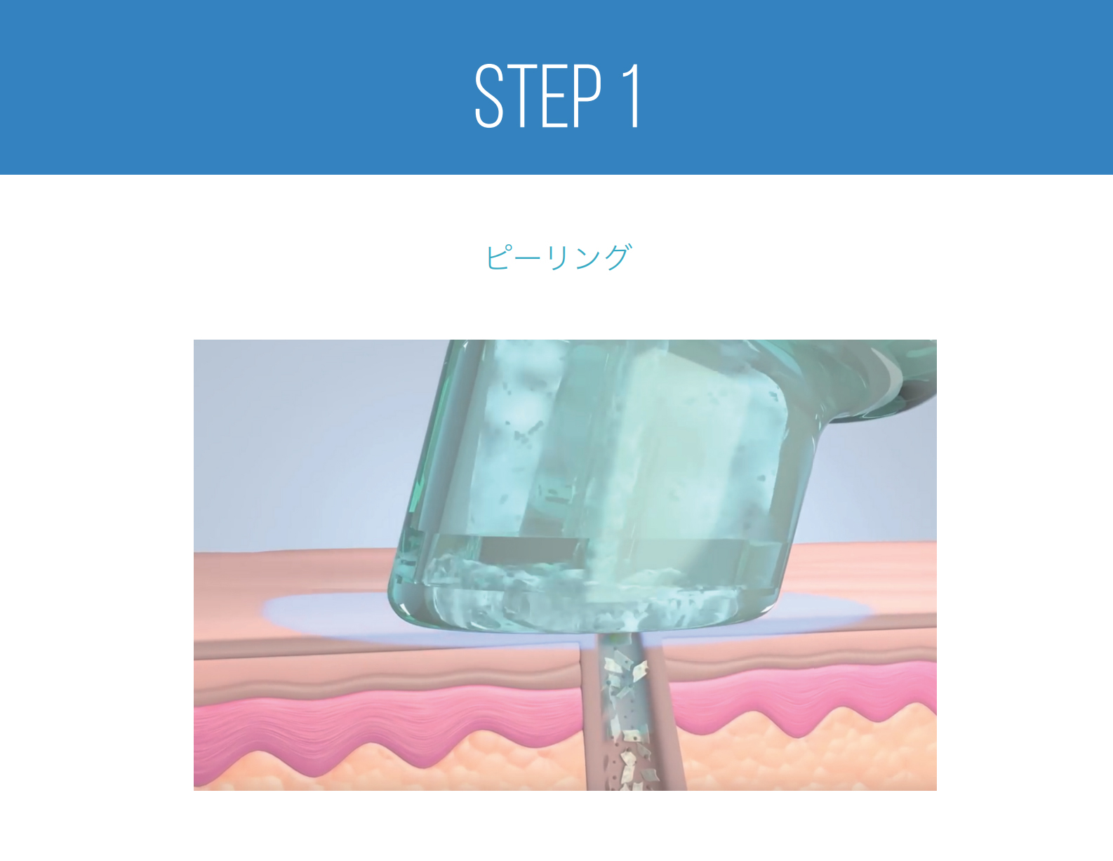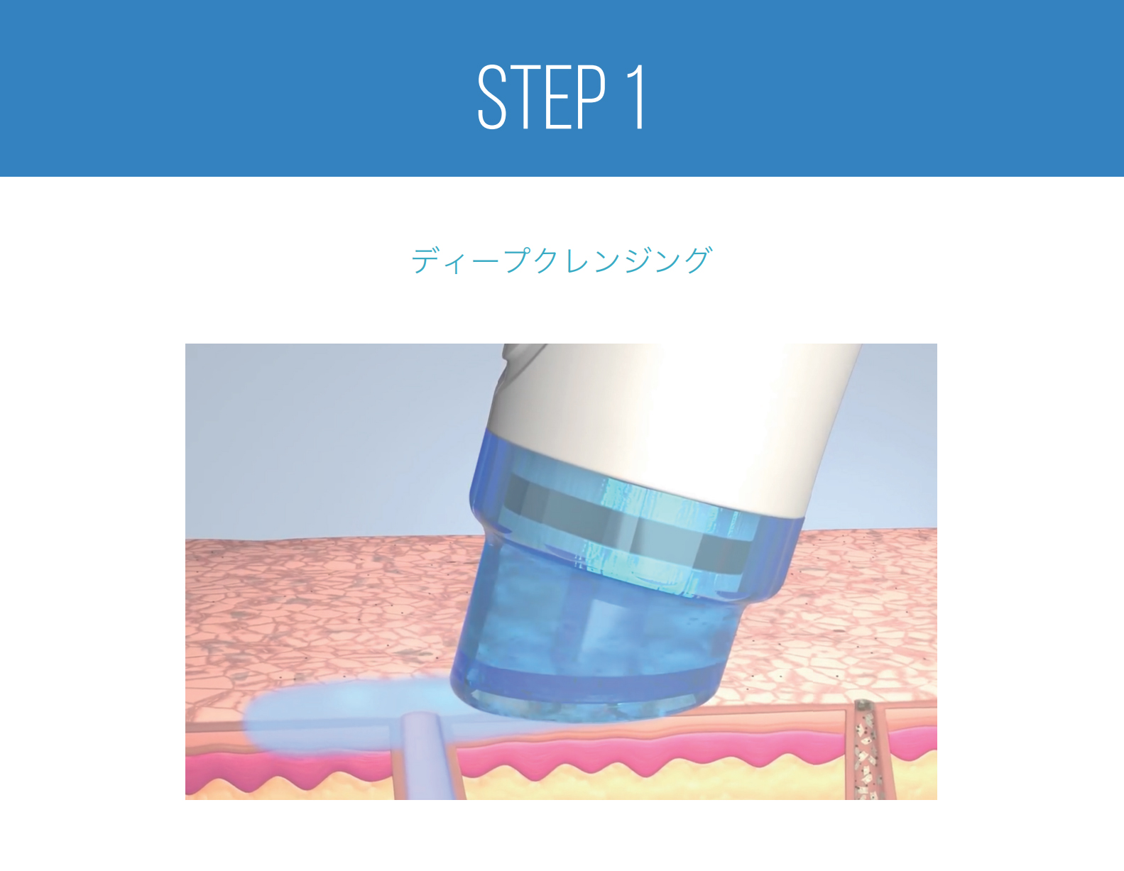 従来のケミカルピーリングとは異なり、水の力を利用し、美容成分を補給しながらピーリングを行う治療機器です。肌への負担が少なく、皮脂や角質を優しく取り除くことができます。