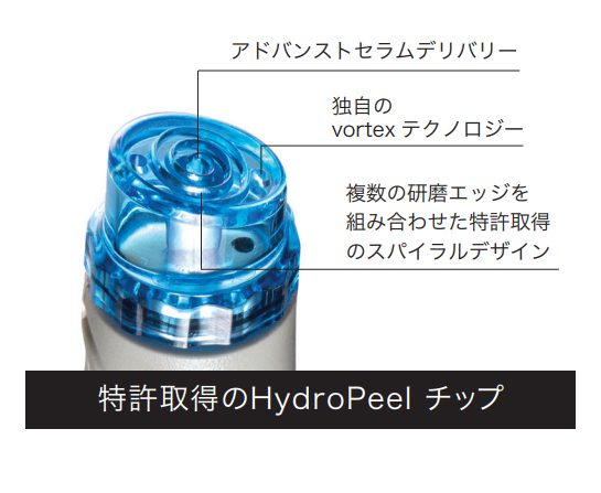 HydroPeel チップのスパイラルデザインと HydraFacial の独自のバキュームテクノロジーを組み合わせることにより、ボルティックス(渦巻)効果を生み出し、不純物を簡単に除去すると同時に抗酸化成分を含む保湿液を肌に供給します。